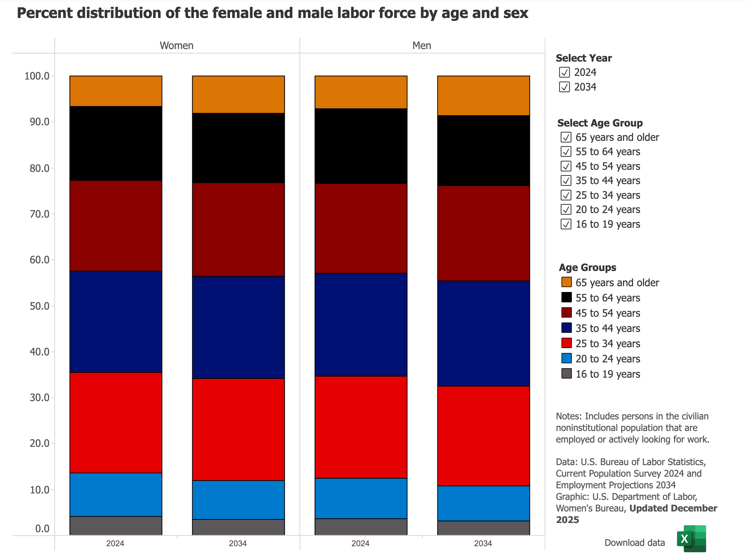 Data from the Women’s Bureau of the U.S. Department of Labor suggest no real difference across multiple age groups in the share of men and share of women in the civilian non-institutional workforce by age and sex. Looking more deeply into the number of civilian non-institutional population, 47.3 percent were women and 52.7 percent were men in 2023 and 2024 across all age groups.